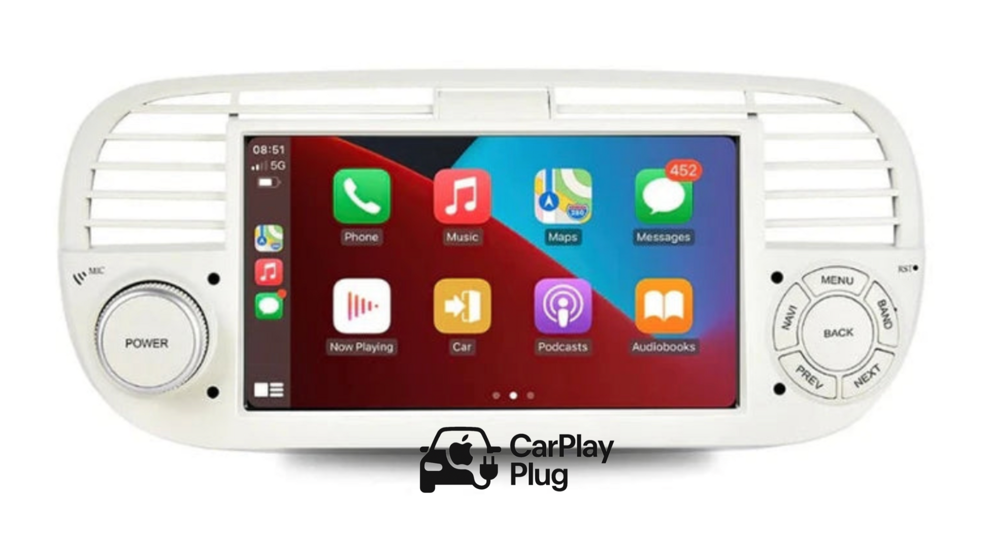 This touchscreen car radio with CarPlay, Android Auto, and Bluetooth is designed for Fiat 500 models from 2007 to 2015. It includes built-in wired CarPlay and Android Auto accessible via the T-Link app, plus support for Bluetooth, USB, and MicroSD inputs. Optional features include DAB radio and integrated GPS. The device covers AM (530-1600 KHz) and FM (87.5-108 MHz) bands and features a responsive 7-inch multi-touch display for seamless operation.